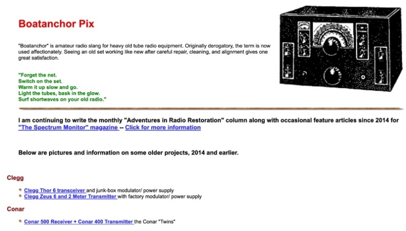 A website deticated to Boathancors, with lots of pictures of some of the most popular ol tube radios from Hallicrafters, Hammarlund, Heathkit, Lafayette, National, Zenith and some projects.